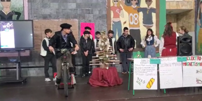 Ameztiko ikasleek txistorra pintxo batek dituen kaloria adina erretzeko egin behar den esfortzua neurtu ahal izateko garatu duten proiektua ikus dezakegu. Proiektu honetan, bizikleta rodiloan jarri eta dinamo bati esker, energia elektrikoa lortzeko proiektua garatu dute.